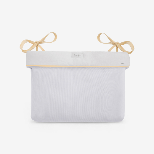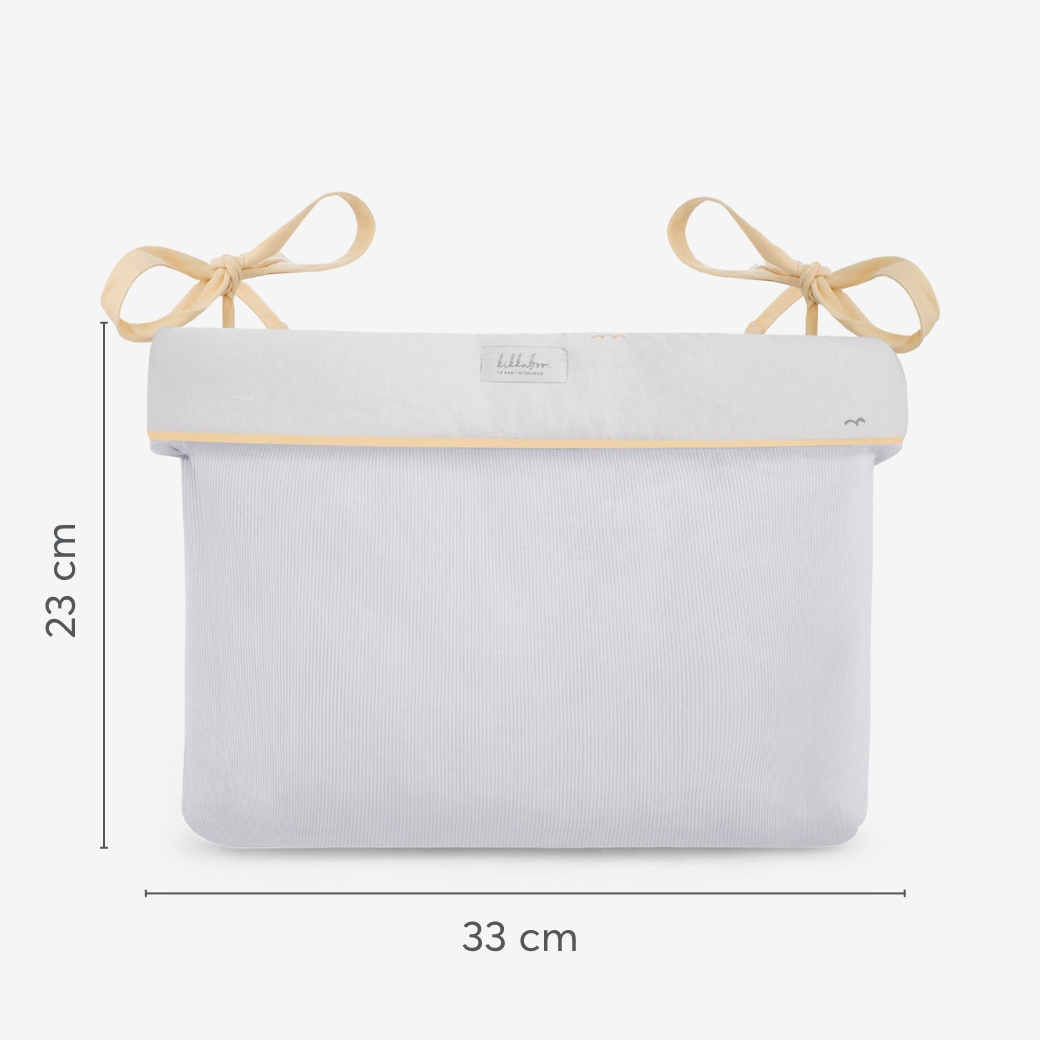 The SEALLY ME Diaper Basket with Ties is a charming and practical addition to any nursery, designed to keep diapers and essentials organized and within reach. It is crafted soft cotton material with playful patterns and embroidery to be both practical and stylish.