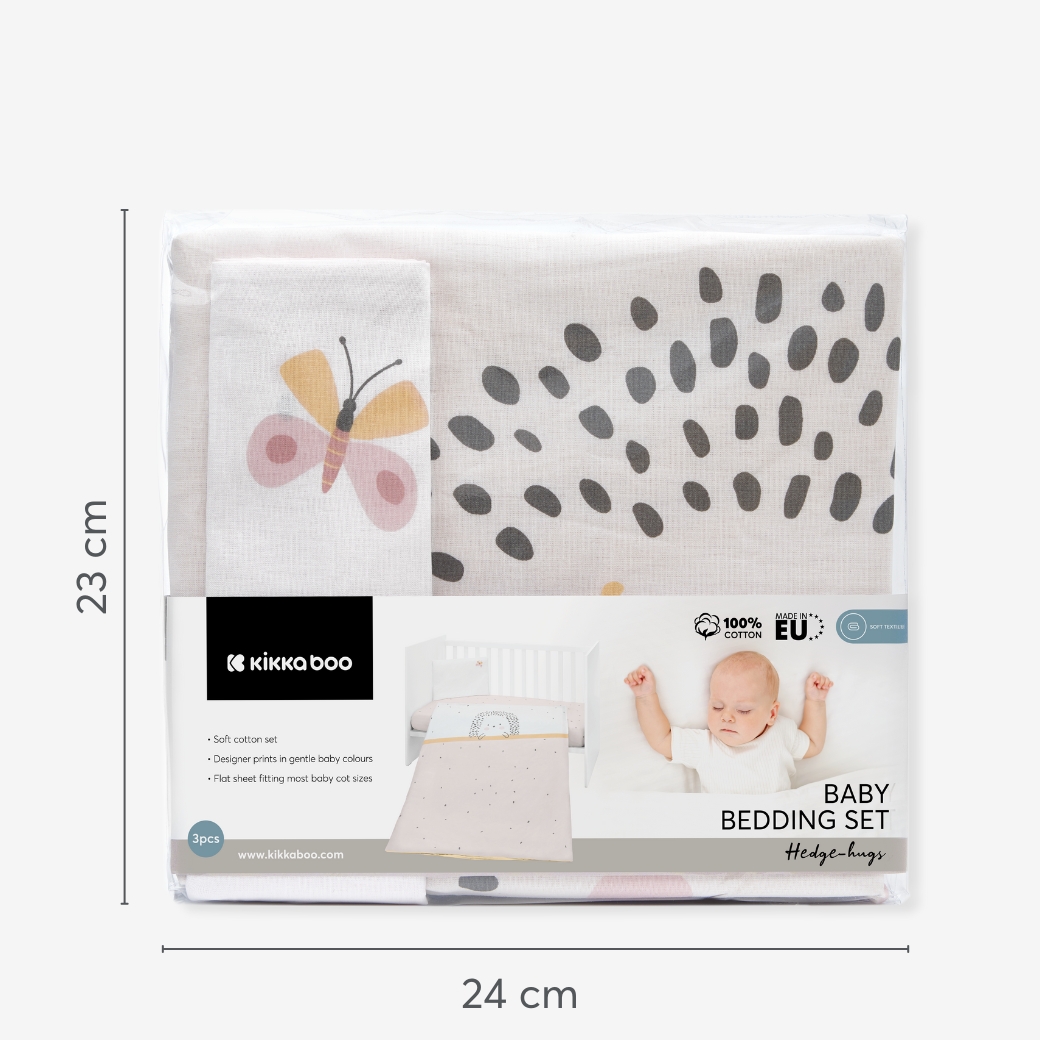 The HEDGE-HUGS Bedding Set 3pcs offers a cozy and stylish addition to your baby’s nursery, crafted from premium 100% ranforce cotton for exceptional softness and breathability. Designed with playful patterns and practical features, this set provides both comfort and charm.