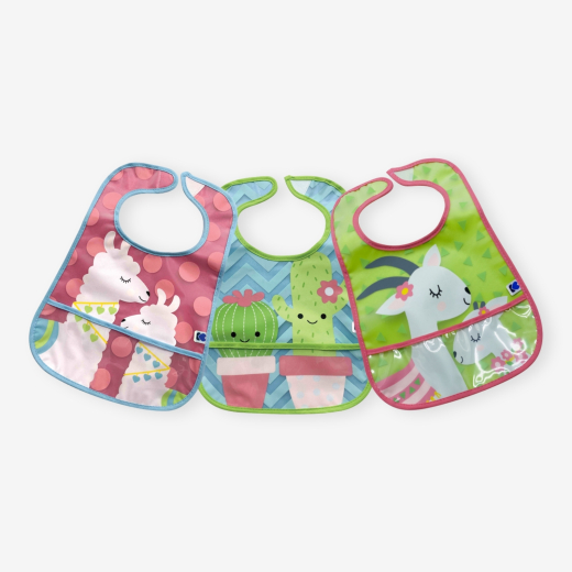Soft on the front, waterproof on the back, and designed with cheerful prints, this 3-piece bib set makes mealtime cleaner, easier, and more enjoyable for both baby and parent.