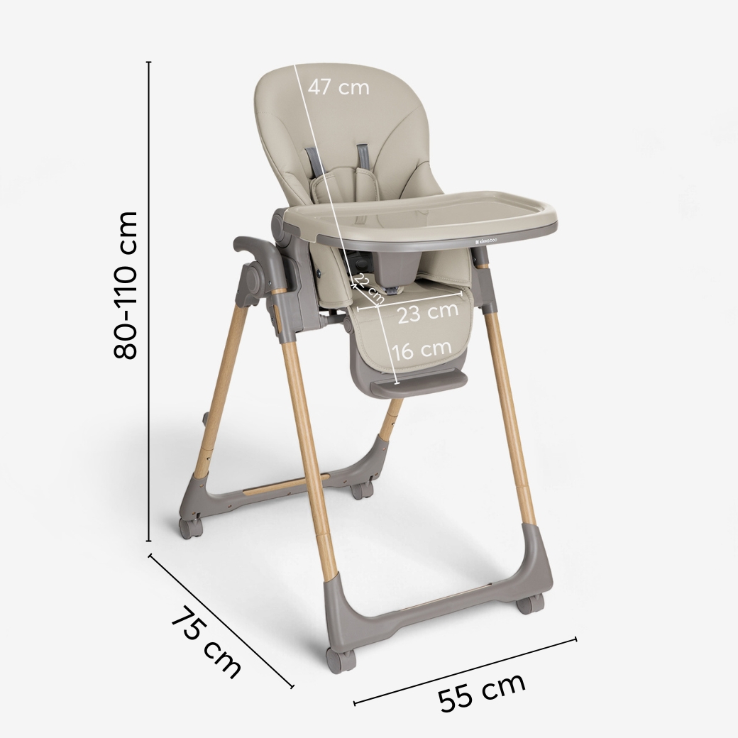 The OLIVE highchair comes with a luxurious and comfortable leather seat pad which is easy to maintain. It folds compactly and is equipped with carrying handles, tray storage on back of the seat and breaks on all 4 wheels for easy maneuverability and storage making it an ideal choice for space-conscious and practical parents.