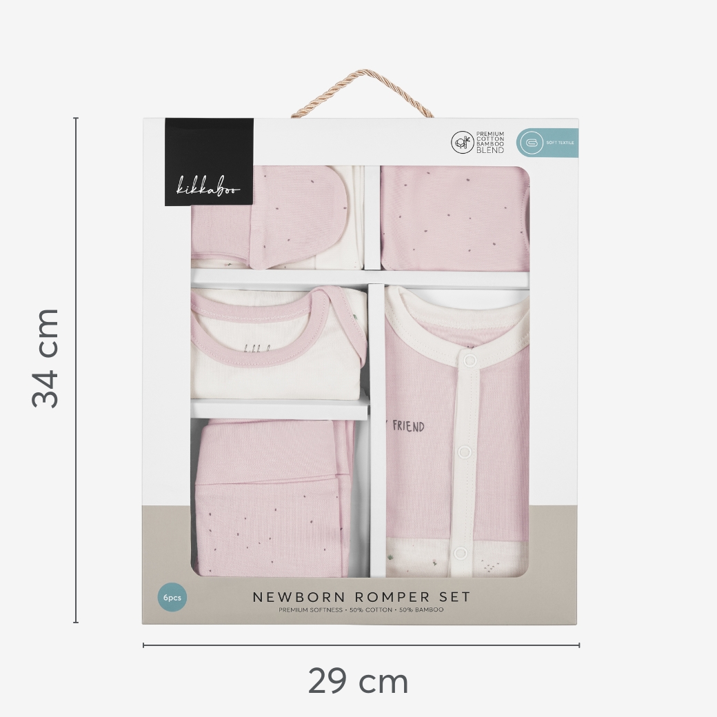 Newborn Romper Set 6 pcs STRIPY FRIENDS is thoughtfully designed to provide everything your baby needs during those precious first days. Crafted from soft premium interlock fabric, this complete outfit set wraps your little one in gentle comfort while combining practicality with charming design.