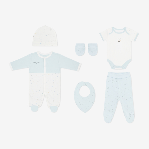 - First-Day Essentials - Includes a short sleeve bodysuit, footed pants, long sleeve jumpsuit, hat, mittens, and bib - carefully selected pieces for everyday comfort.