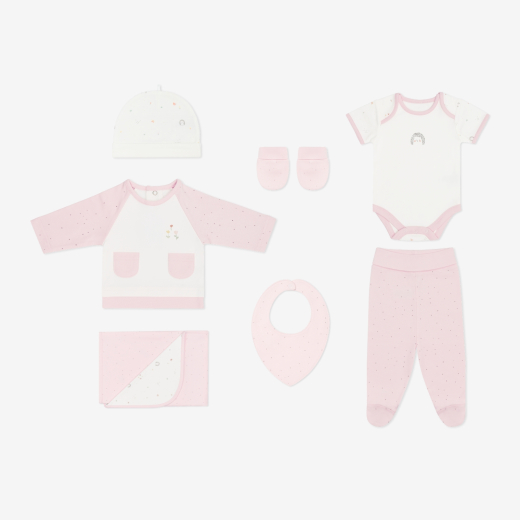 Newborn Romper Set 7 pcs HEDGE-HUGS is a beautifully curated collection designed to welcome your little one with comfort, warmth, and thoughtful detail from day one. Crafted from soft premium interlock fabric, this complete set combines everyday essentials with a cozy blanket — everything needed for those precious first moments.