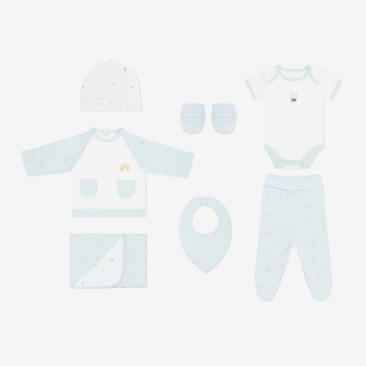 - Complete First-Day Collection – Includes a short sleeve bodysuit, long sleeve top, footed pants, hat, mittens, bib, and a double-layer baby blanket (85x85 cm) for extra warmth and comfort.